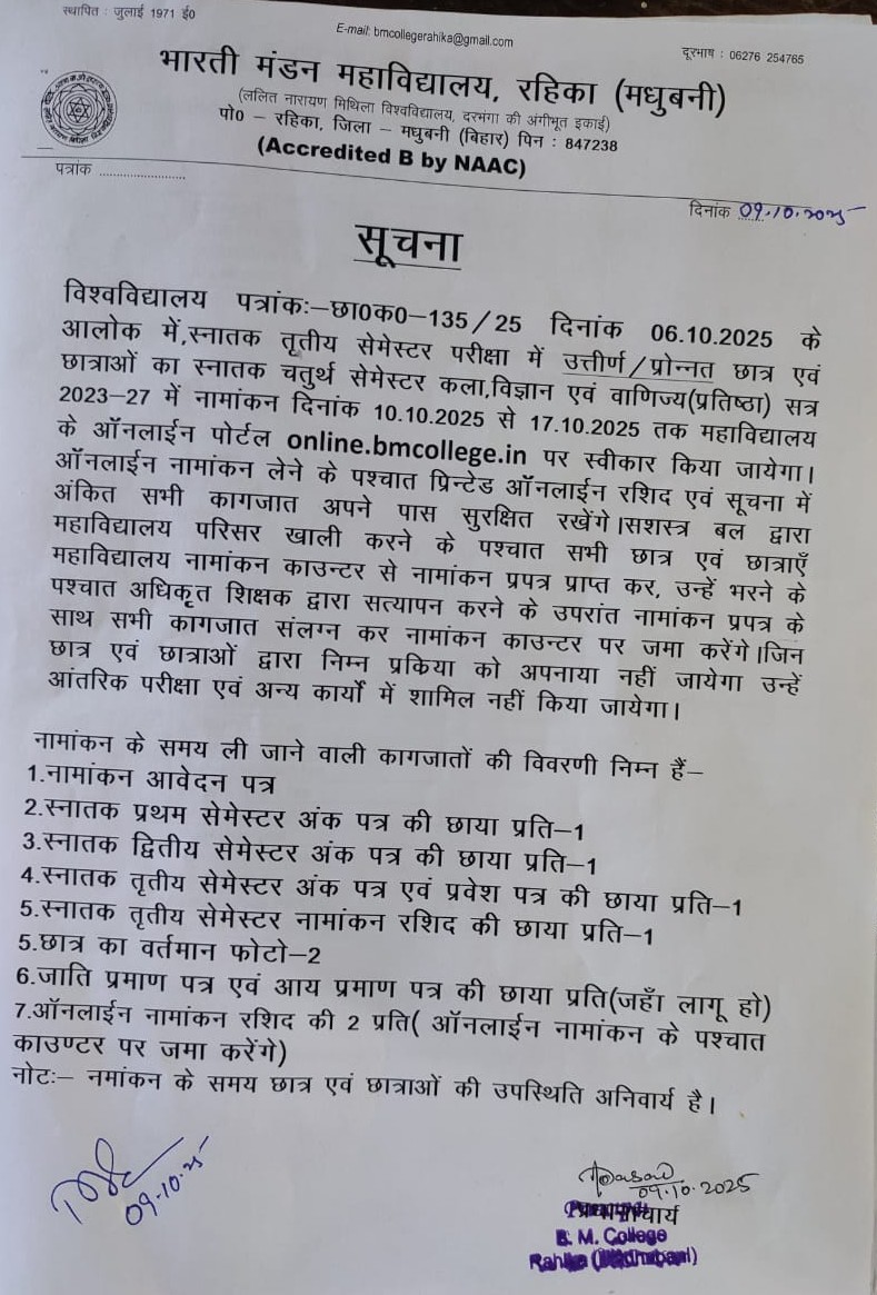NOTICE REGARDING UG 4TH SEMESTER ADMISSION (2023-27)