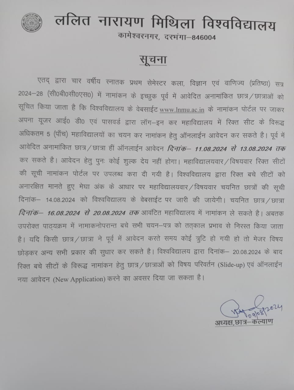NOTICE REGARDING UG 1ST SEMESTER (2024-28) SPOT ADMISSION